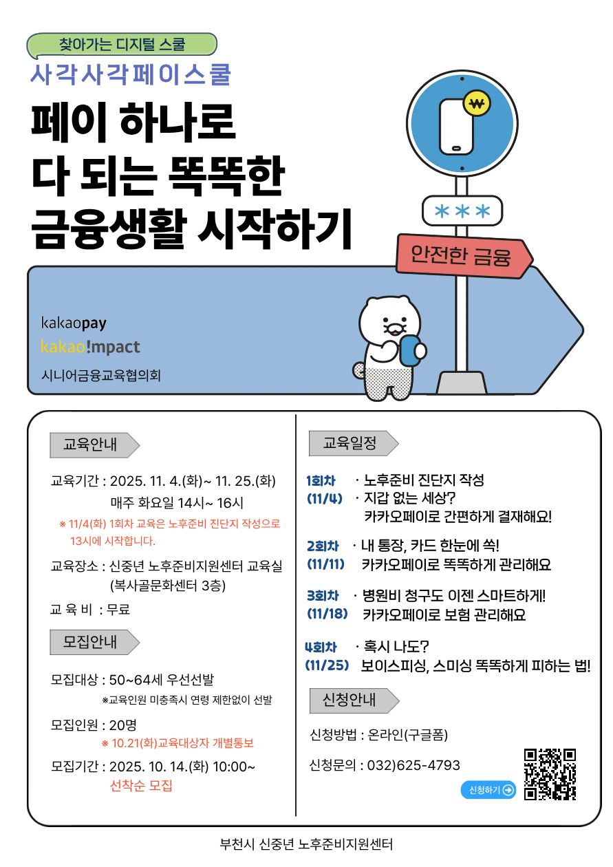 - 교육장소 : 부천시 신중년 노후준비지원센터 교육실(복사골문화센터 3층)