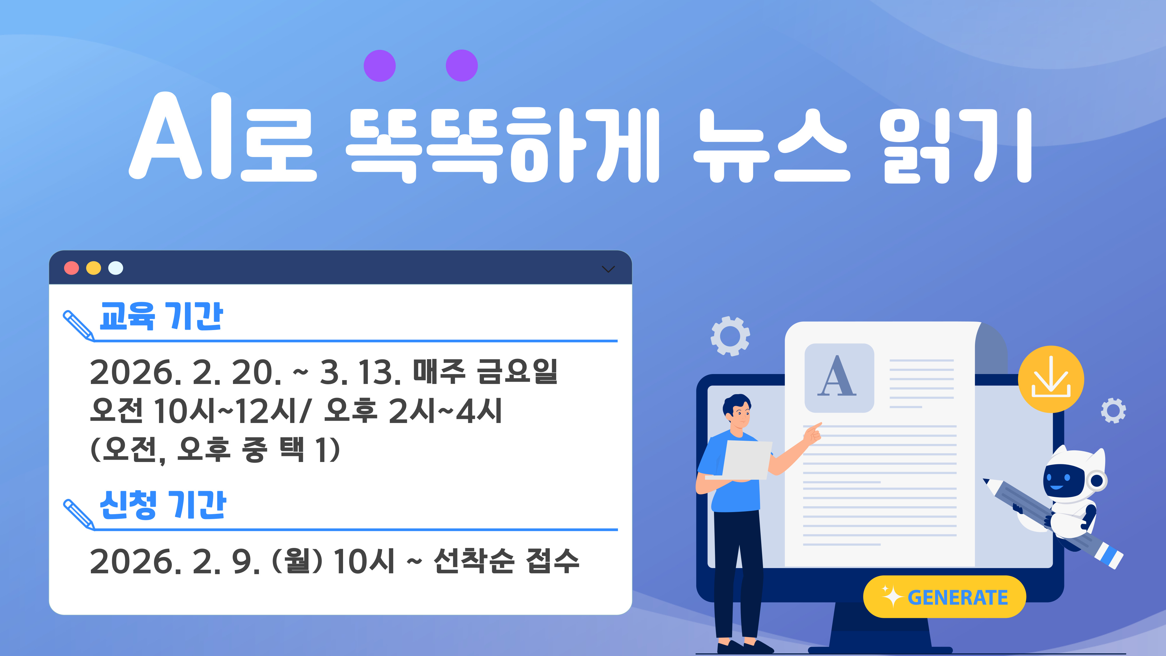 공지사항182024-10노후준비, 가볍게 시작해보아요!<2/9(월) 접수시작> AI로 똑똑하게 뉴스 읽기 교육생 모집2026-01-22「노후가 가벼워지는 주택연금」 특강2026-01-20<접수마감>「여가 · 대인관계 아카데미」 교육생 모집2026-01-16<접수마감>『2026년 개정세법과 자산관리』 재무특강 개최2026-01-15공지사항 더보기
